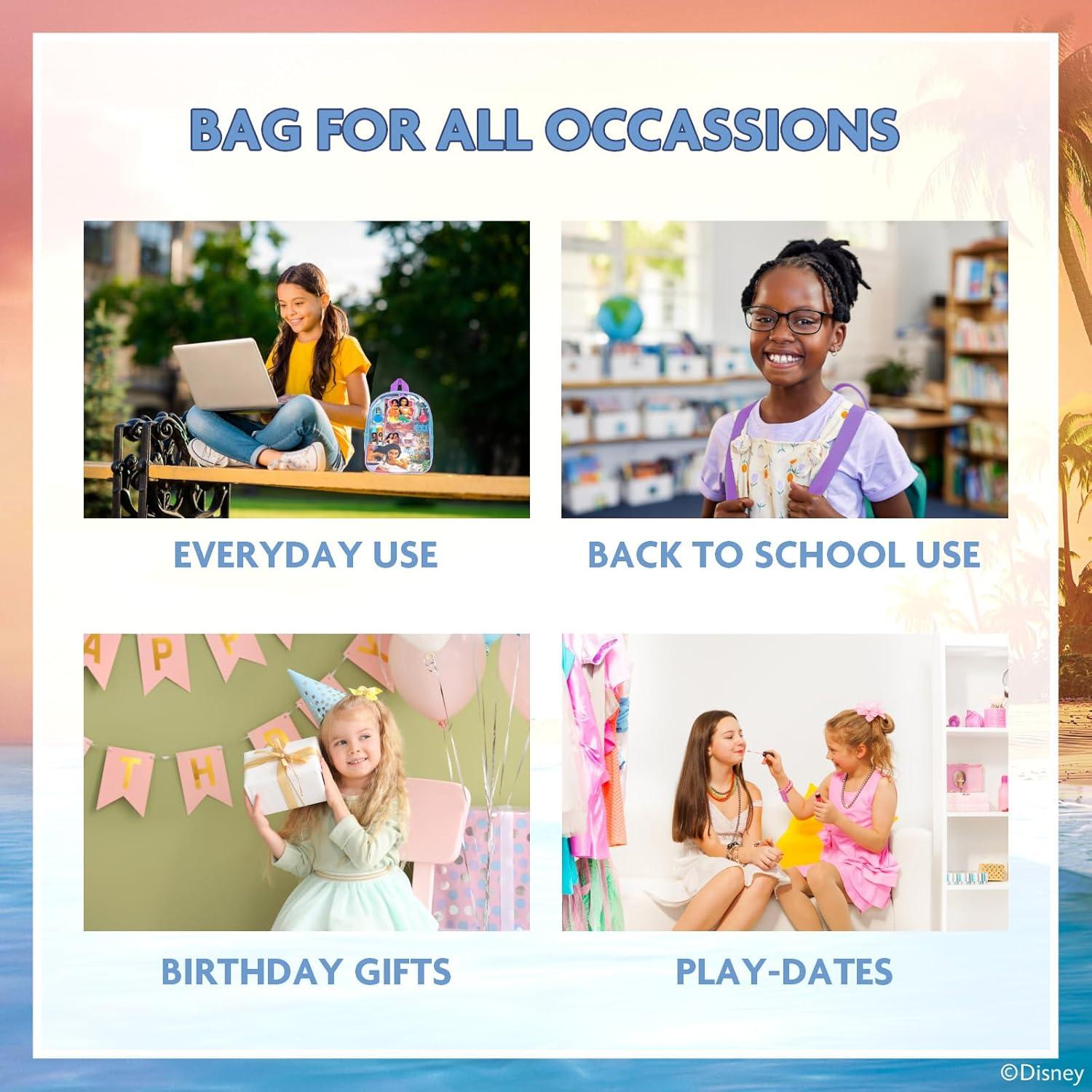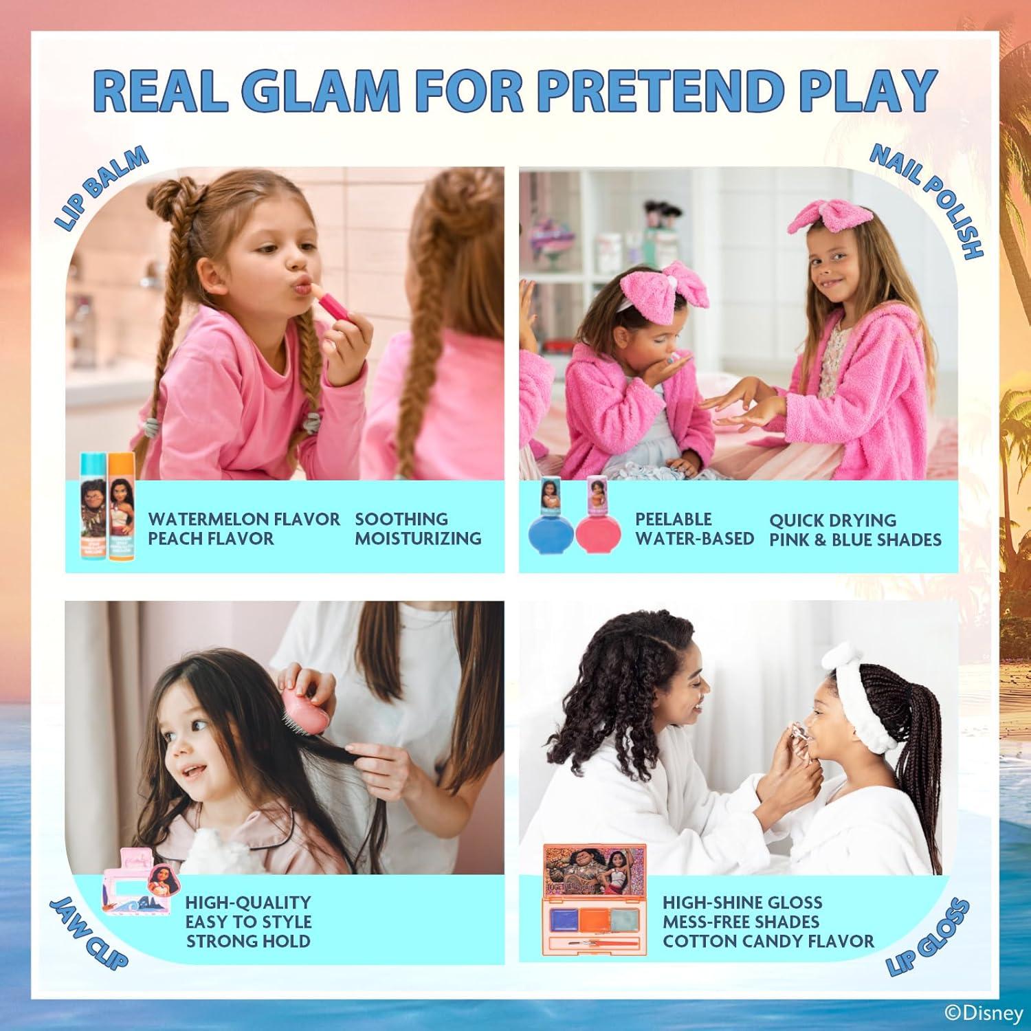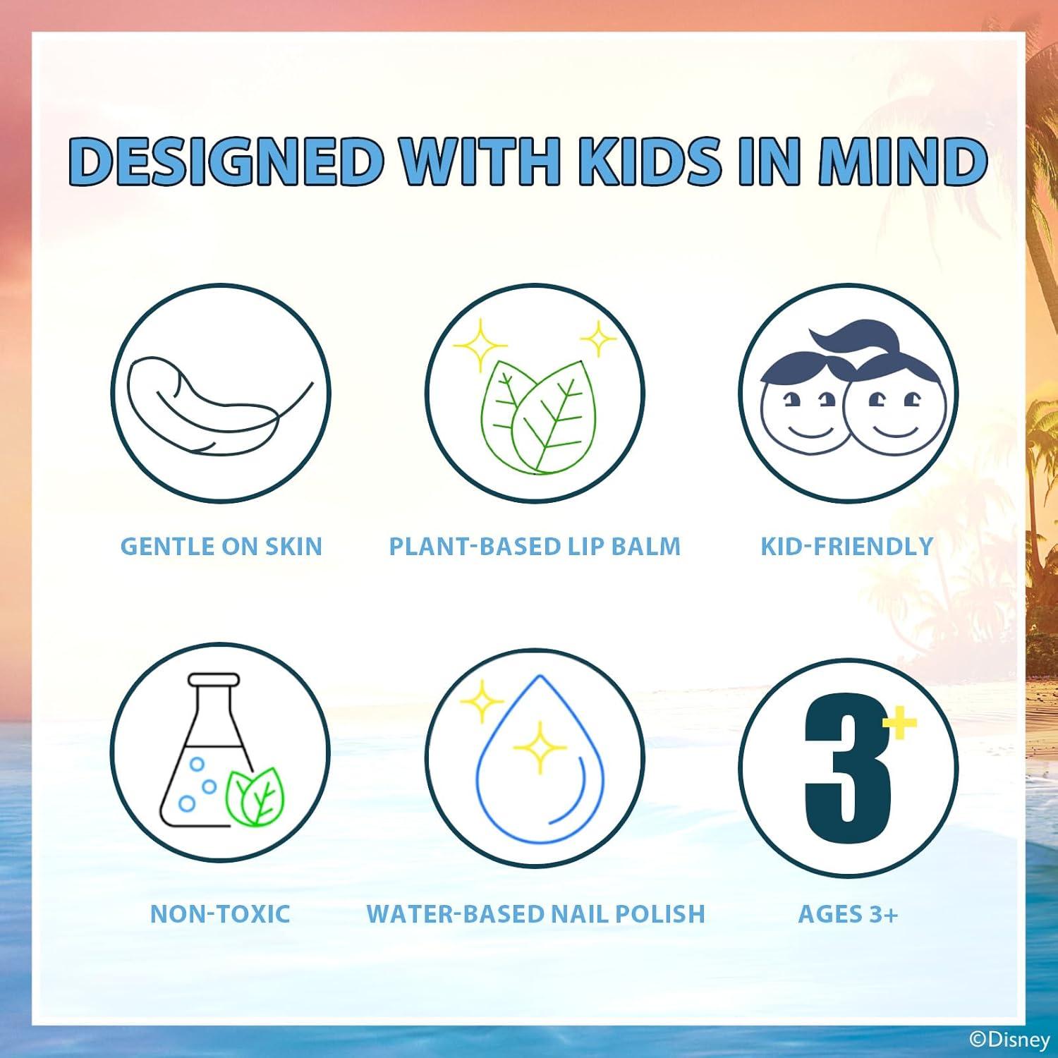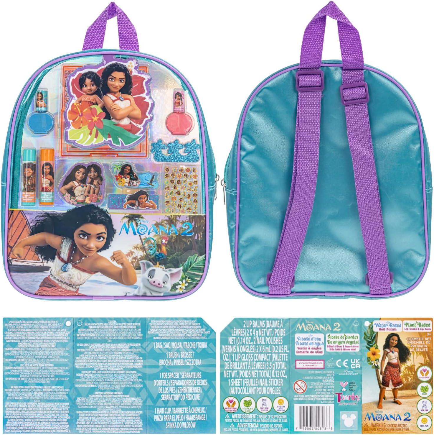 SET INCLUDES: Assortment of 2 bubble gum scented nail polishes, 2 lip balms that are watermelon and peach flavored, 1 glittery toe spacer, 1 jaw clip, 1 3-well, cotton candy flavored lip gloss compact, 1 sheet of nail stickers, and 1 nail file all packed in a fun, reusable, Moana 2 backpack.
