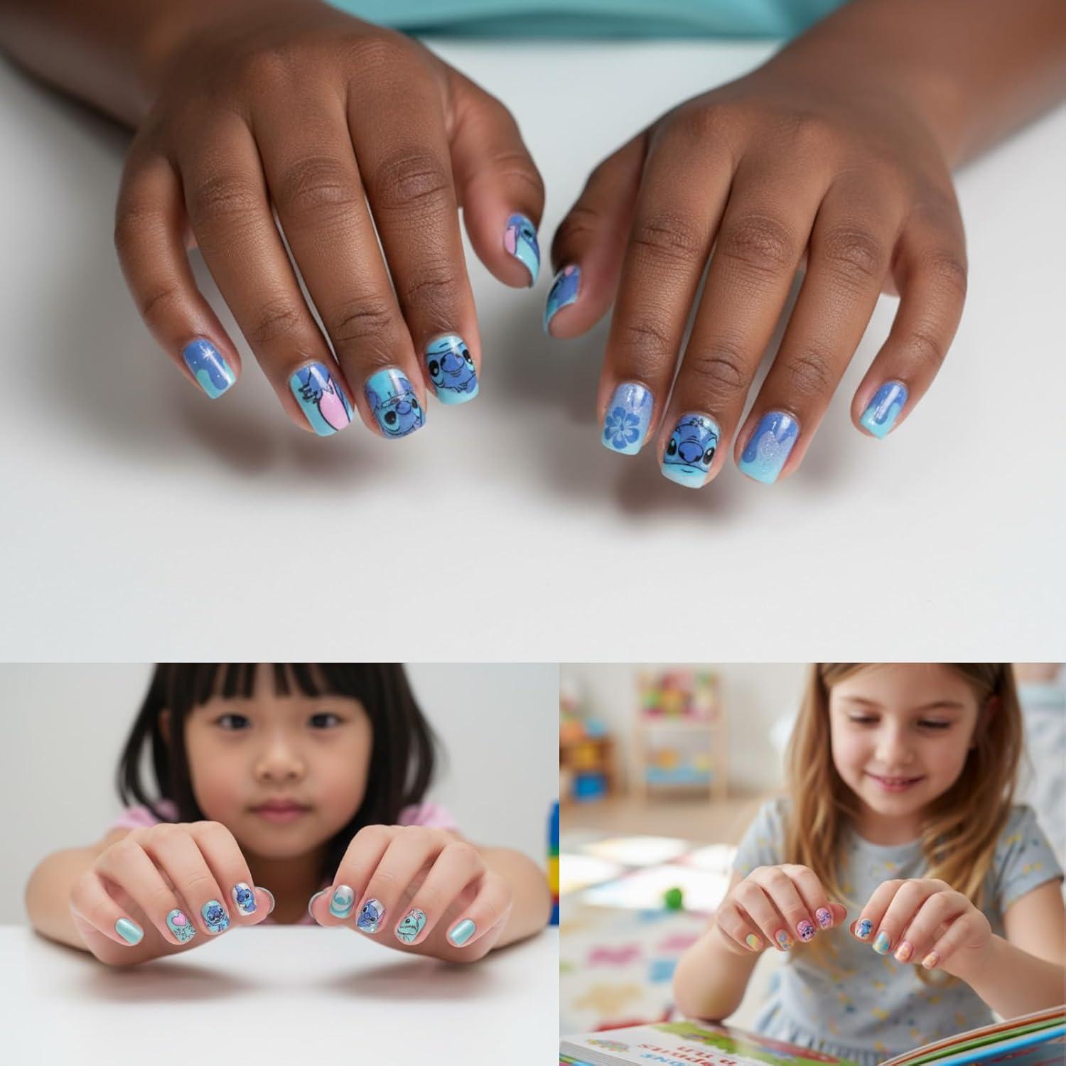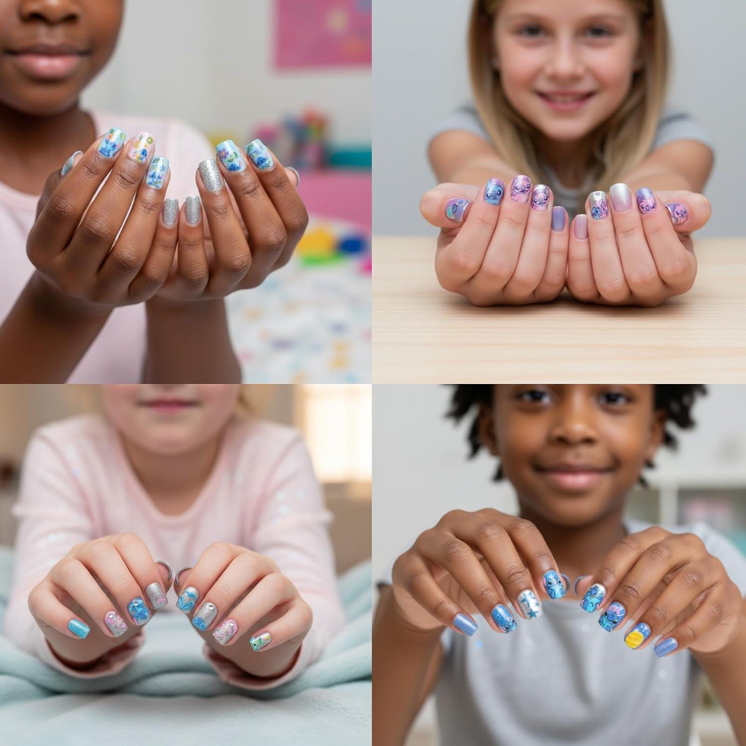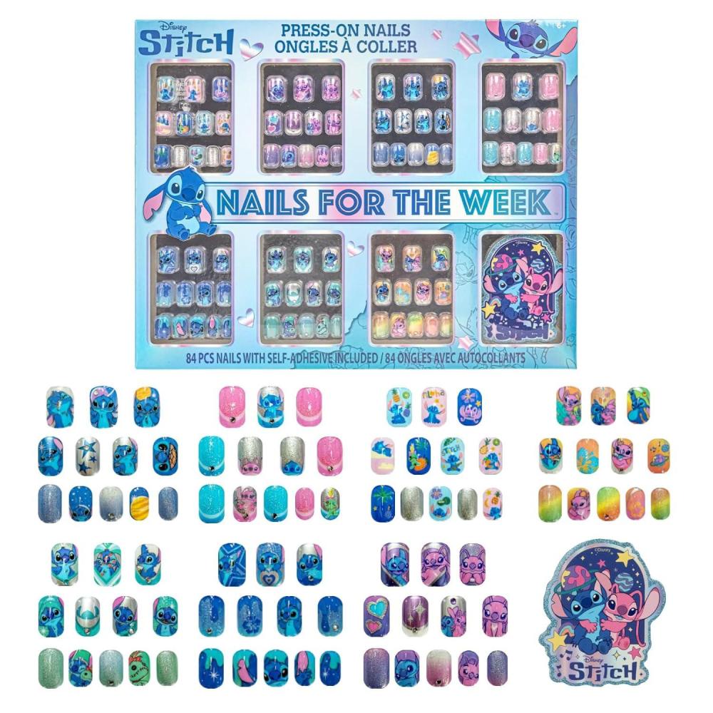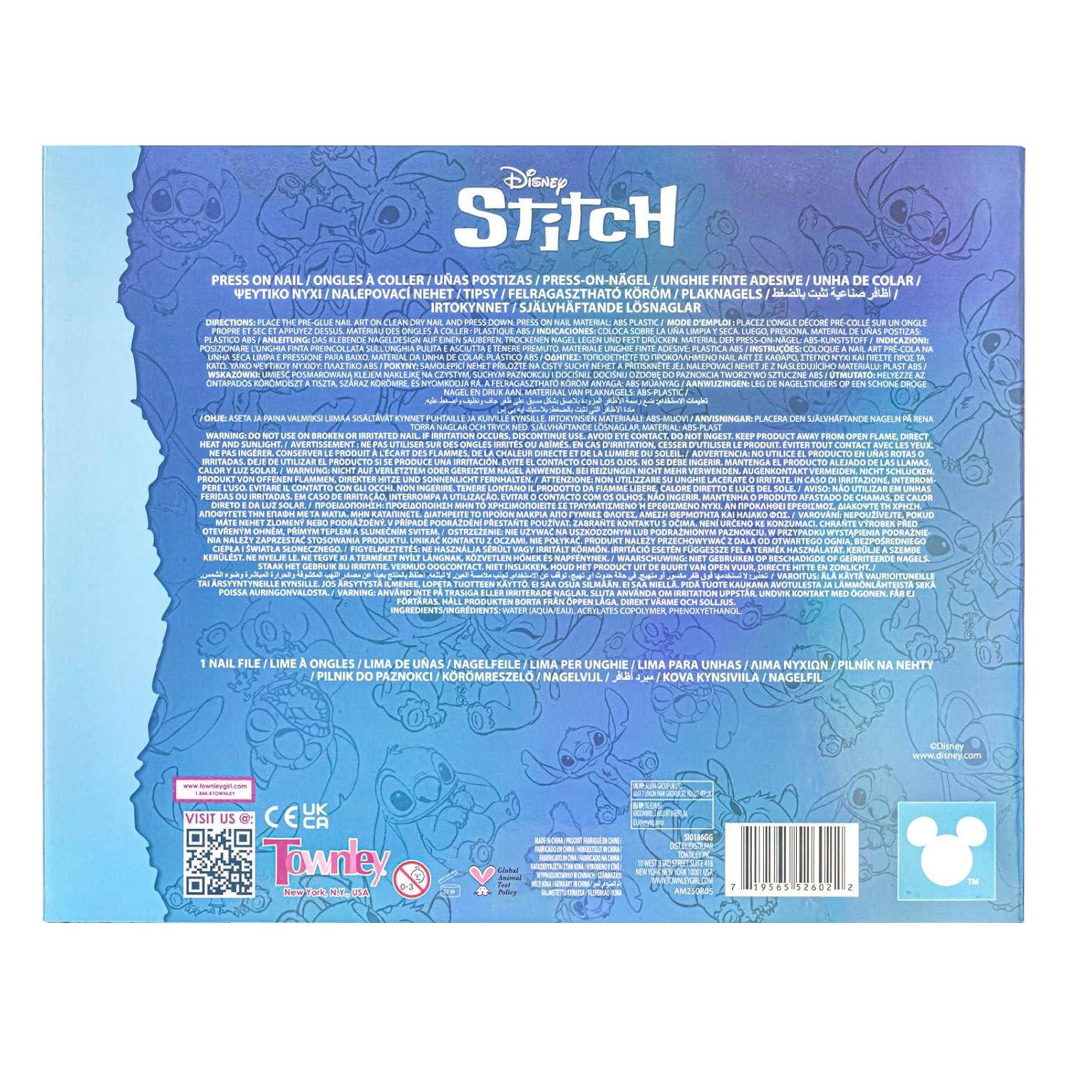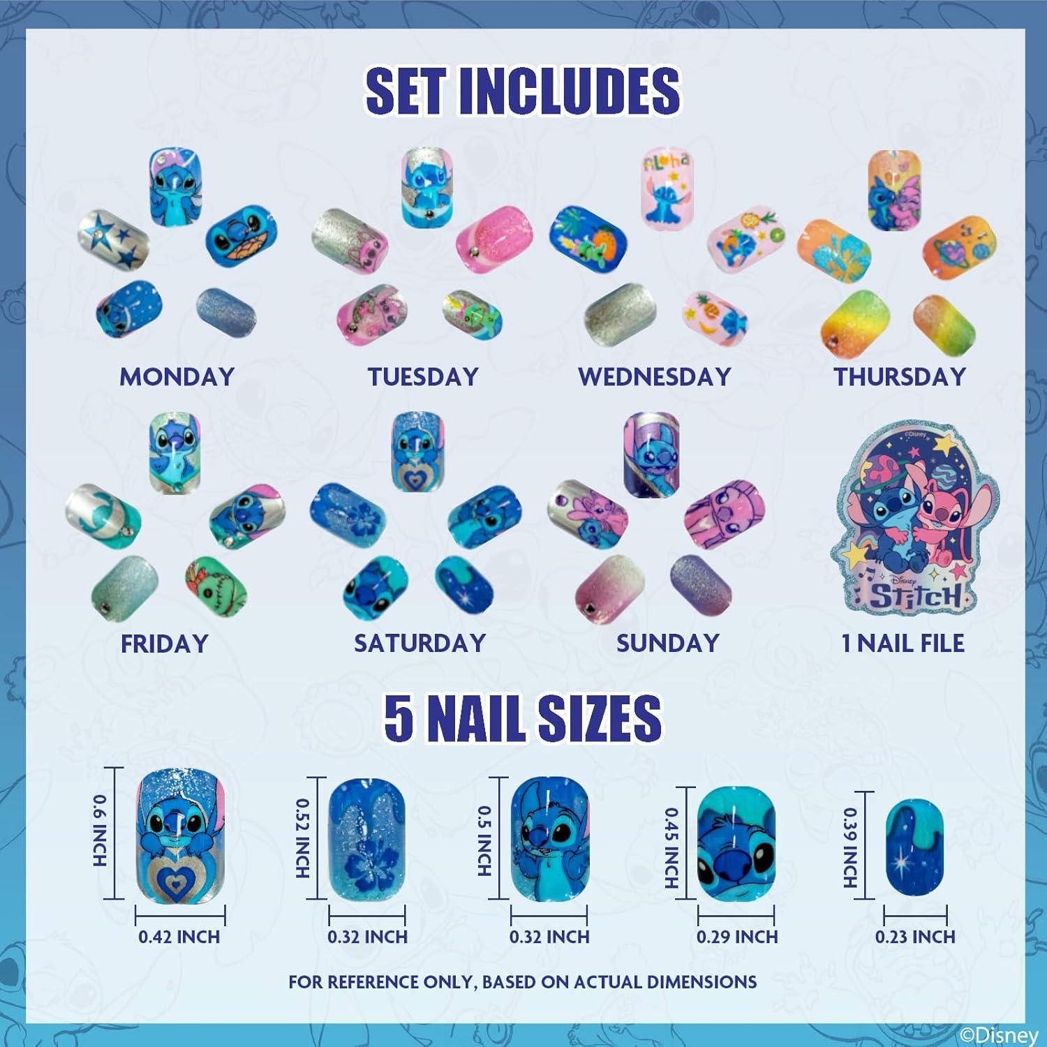 Add an out of-this-world twist to manicures with this Disney Stitch and Angel Press-On Nail Set! Featuring tons of fun, colorful designs, all inspired by the cutest cosmic couple, Stitch and Angel, this set allows children to mix, match, and style their nails with ease. Each nail is pre-glued for mess-free application, simple press and go! With 84 kid-sized, Stitch-themed nails, accompanied by a nail file for shaping and prepping nails, it's just the thing to spruce up her manis even more. Safe and easy to remove, this set is perfect for girls ages 6 and up, making it the ideal party favor, stocking stuffer, or to gift for birthdays, holidays, or just because. Being that it is sure to be at the top of every Stitch fan's wishlist, it also is a great addition to all playdates, sleepovers, spa days, and more, bringing much styling fun to all days.