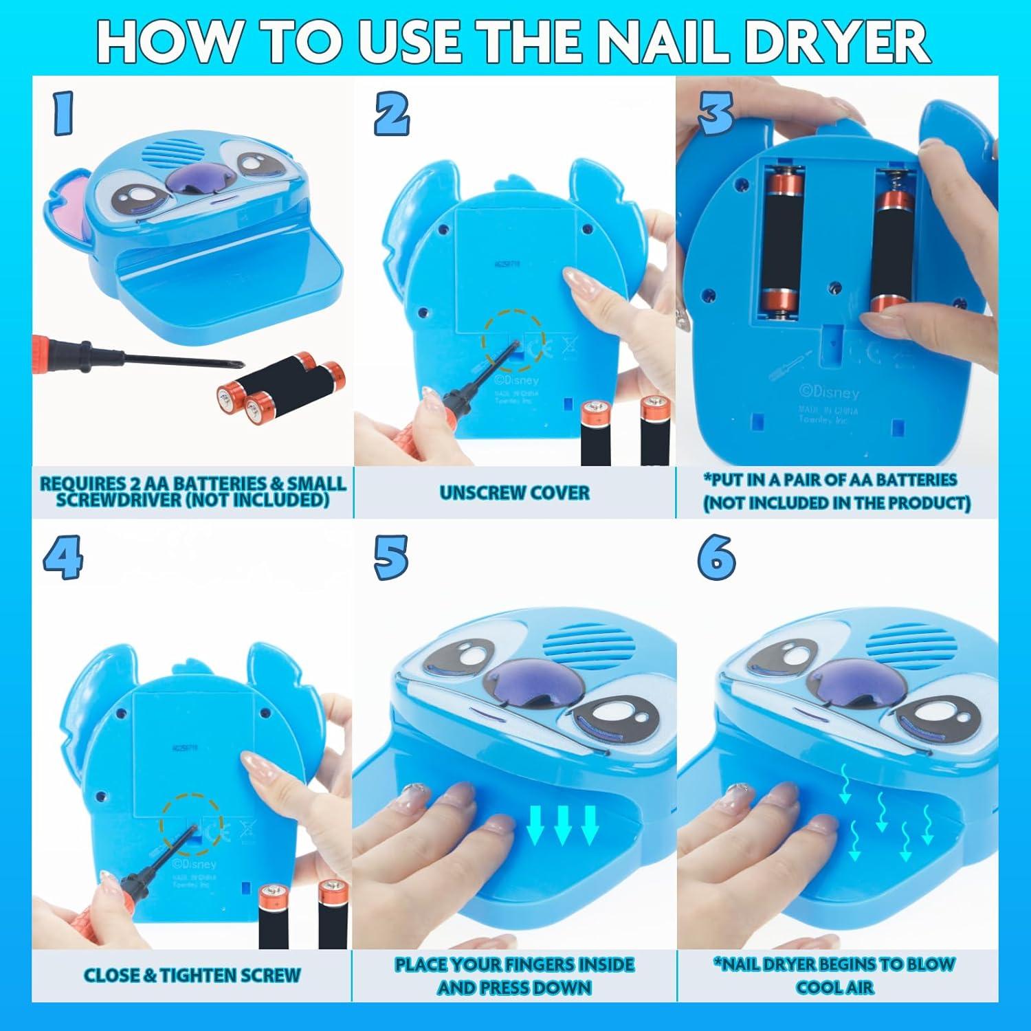 SET INCLUDES: This set includes 16 different opaque and shimmery shades that includes different shades of purple, pink, green, red, blue, and more. Paired off with a Stitch-shaped, role-play nail dryer (batteries not included).