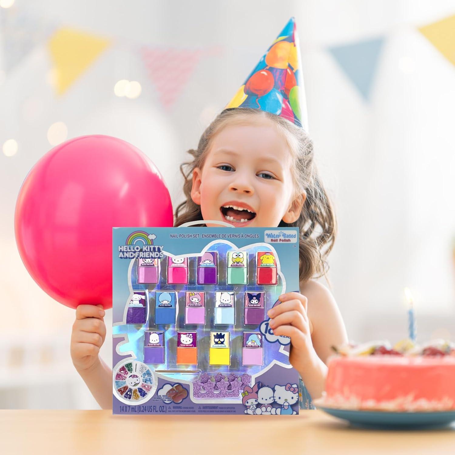 KIT INCLUDES: 14 bubble gum scented nail polish bottles with glittery and opaque colors. Shades includes : orange glitter, green glitter, purple shimmer, neon green, purple glitter, teal glitter, pink confetti, silver confetti, and so many more colors! Also comes with nail gems, 2 toe spacers, and cuticle stick.